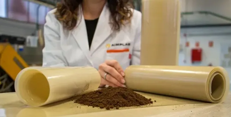 As part of the European WaysTUP! project, the AIMPLAS Institute has developed a bio-based plastic film from used coffee grounds, collected by BIOBEAN from restaurants. The process involves extracting PHA (a type of biopolymer) from the waste, formulating it to be processable by extrusion, and finally transforming it into a film for flexible packaging.